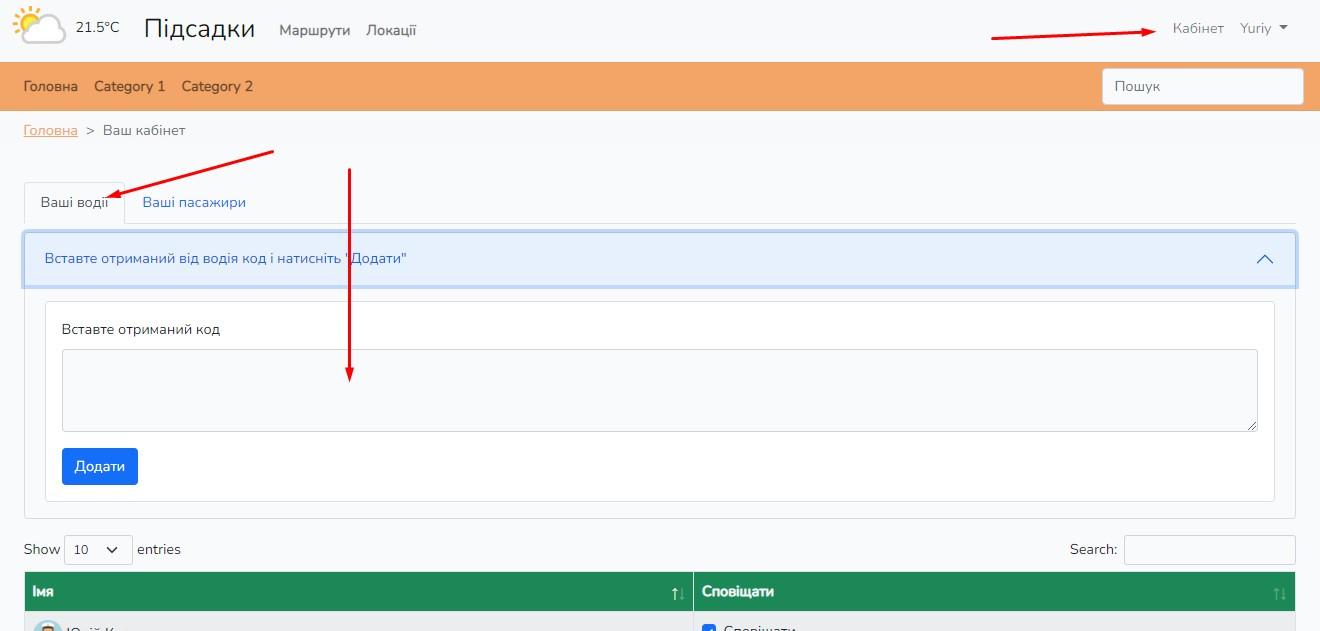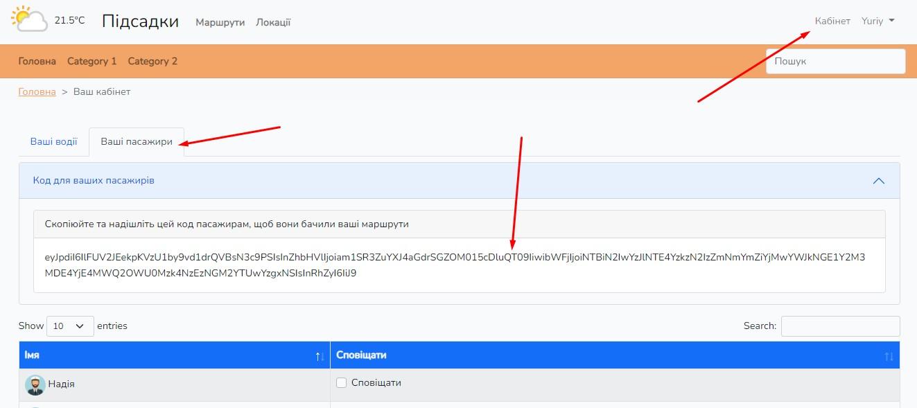 2. В кабінеті, якщо ви бажаєте підвозити людей, скопіюйте код для пасажирів та надішліть його своїм друзям - потенціййним пасажирам