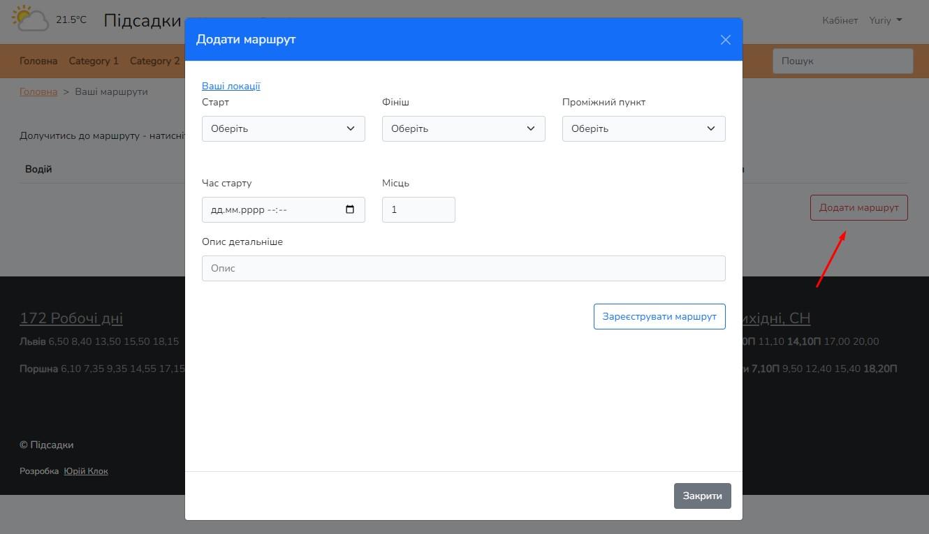 Натисніть кнопку "Додати маршрут " і заповніть форму, вибравши у випадайках точки старту та фінішу з ваших локацій, також вкажіть час і кількість місць.