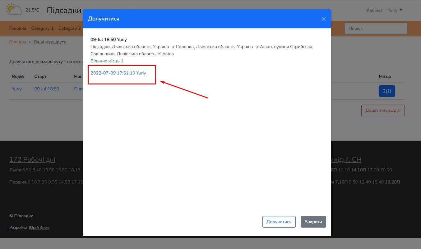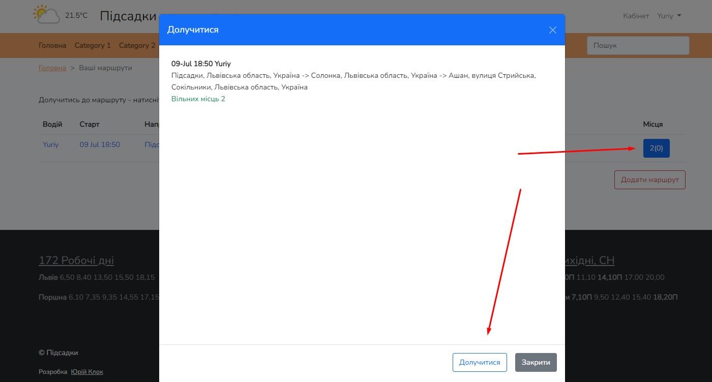 6. Долучитися до маршруту можна натиснувши синю кнпку, з місцями, і у віконечку натиснути "Долучитися"
